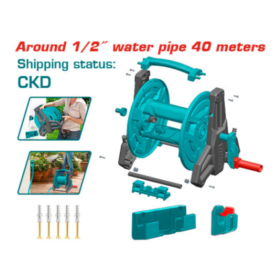 CARRETE (ENROLLADOR) DE MANGUERA 40M (NO ENSAMBLADO) - TOTAL REF: THHR40121 Se puede enrollar alrededor de una tubería de agua de 1/2" de 40 metros. Asa plegable para un fácil almacenamiento Soporte de tubo de aluminio, se puede colgar en la pared. Se suministra en piezas y los usuarios deben montarlas ellos mismos. Mango alargado y ampliado, diseño antipellizcos. Material: PP, aluminio.