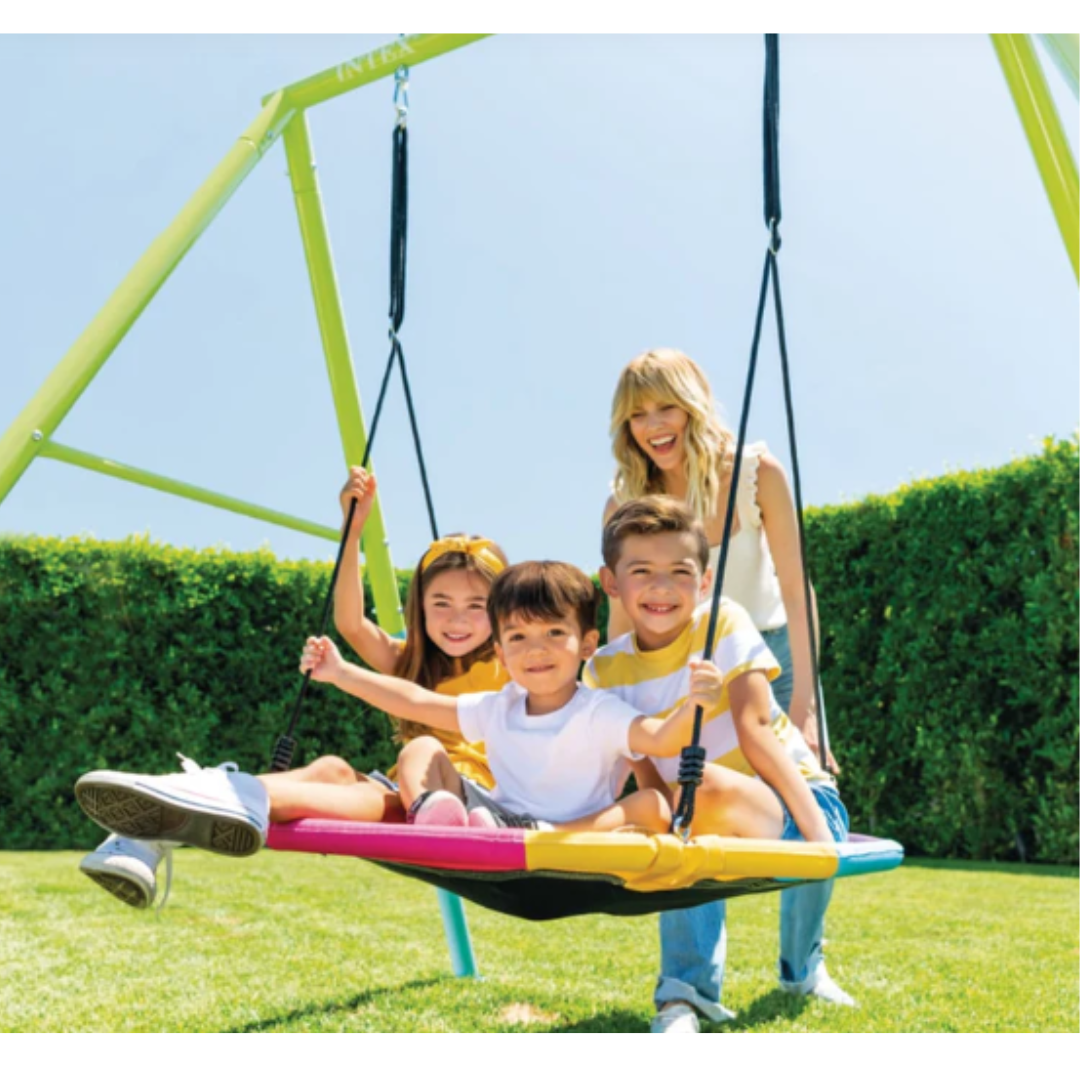 Columpio de nido octogonal Dimensiones: 201 x 235 x 200 cm Color: verde y azul Paleria de acero galvanizado resistente al óxido con diseño robusto en A Balancín octogonal de diámetro 102 cm, regulable en altura, fabricado en acero acolchado con esponja y revestido de un resistente tejido Oxford multicolor