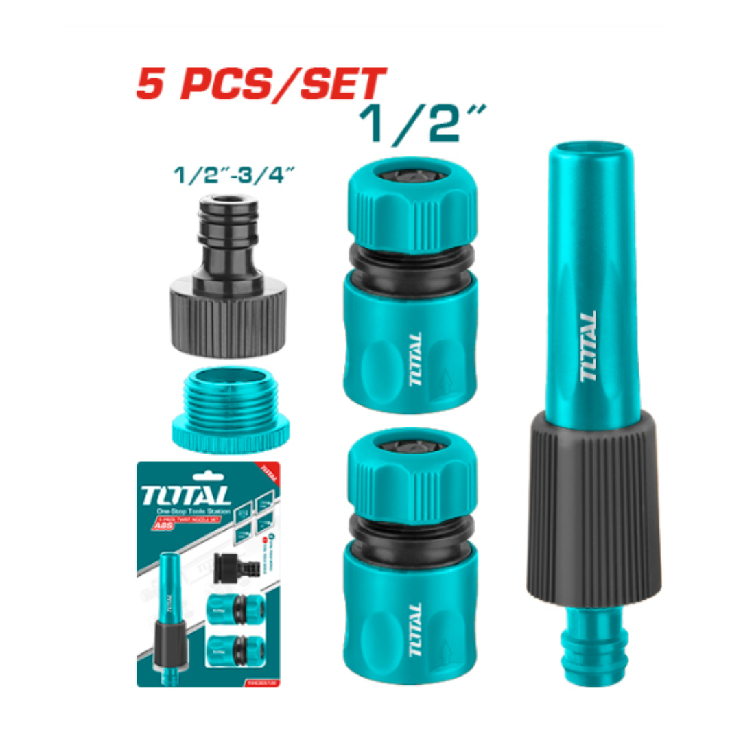 JUEGO BOQUILLAS GIRATORIAS (ACOPLES PARA RIEGO) (5 PZS) - TOTAL REF: THHCS05122 Juego de 5 boquillas giratorias Con conector rápido de manguera de plástico de 1 pieza de 1/2 "con parada de agua Con conector rápido de manguera de plástico de 1 pieza de 1/2 "" Con 1 ADAPTADOR DE GRIFO DE 3/4"" Y REDUCTOR DE 1/2"-3/4"" Con 1 boquilla giratoria a presión de 5 " Empacado con colgador de papel