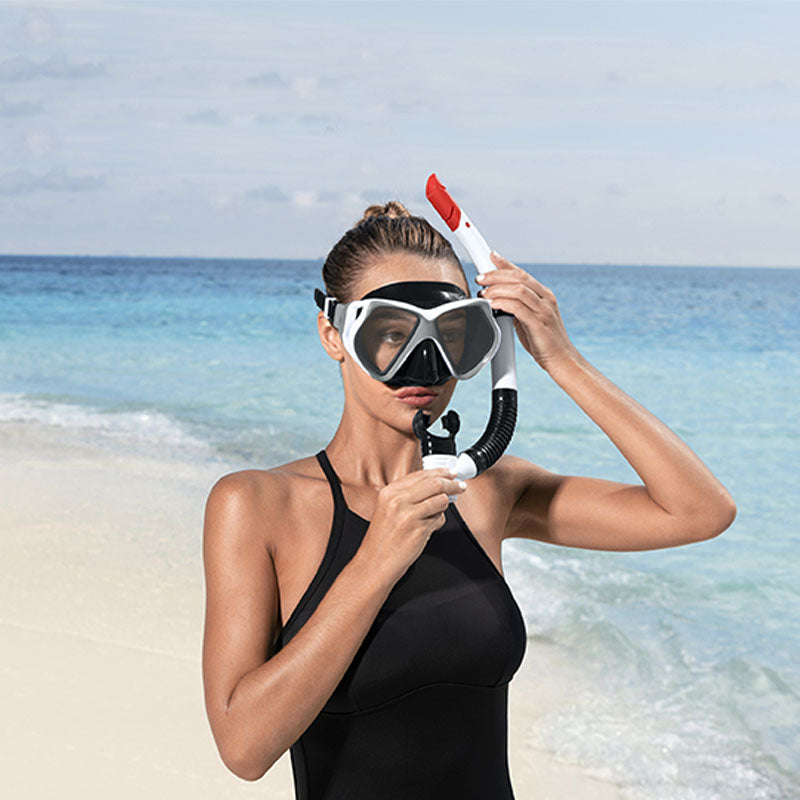 El juego de esnórquel para adultos BESTWAY incluye una máscara de buceo completa fabricada en silicona de alta calidad, con una sola lente de vidrio templado recubierto que garantiza durabilidad y una visión clara bajo el agua. Ideal para esnórquel y natación, cuenta con máscara y snorkel diseñados para mayor comodidad.