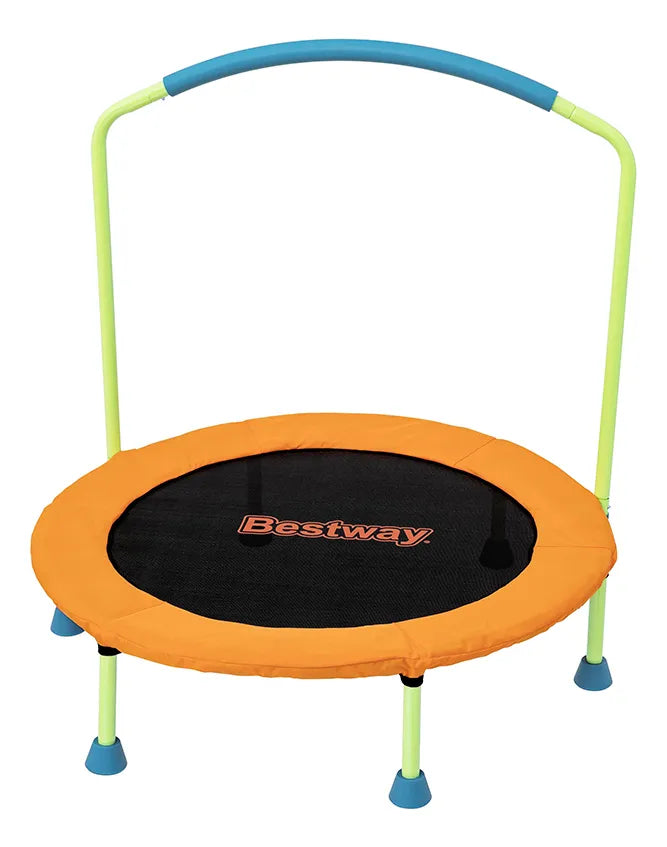 Este trampolín Wonderjump de Bestway tiene una lona de salto negra y un cobertor de resortes naranja. Con un diámetro de 91 cm y forma circular, soporta hasta 25 kg, ideal para que los niños se diviertan saltando y brincando con seguridad. Perfecto para el entretenimiento activo en casa.